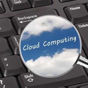 Magnifying glass showing clouds on a keyboard. Concept for cloud